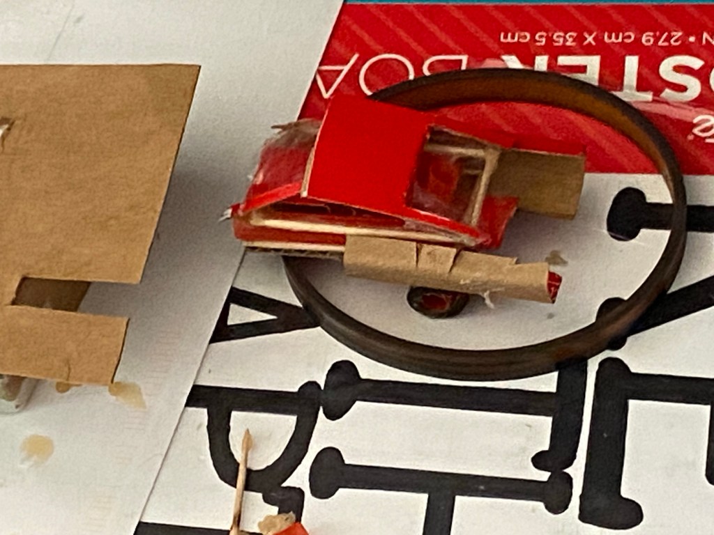 The wheels are soda straws and used rubber belts from machinery from work. The treads are paper and cellophane tape touched up with black marker.