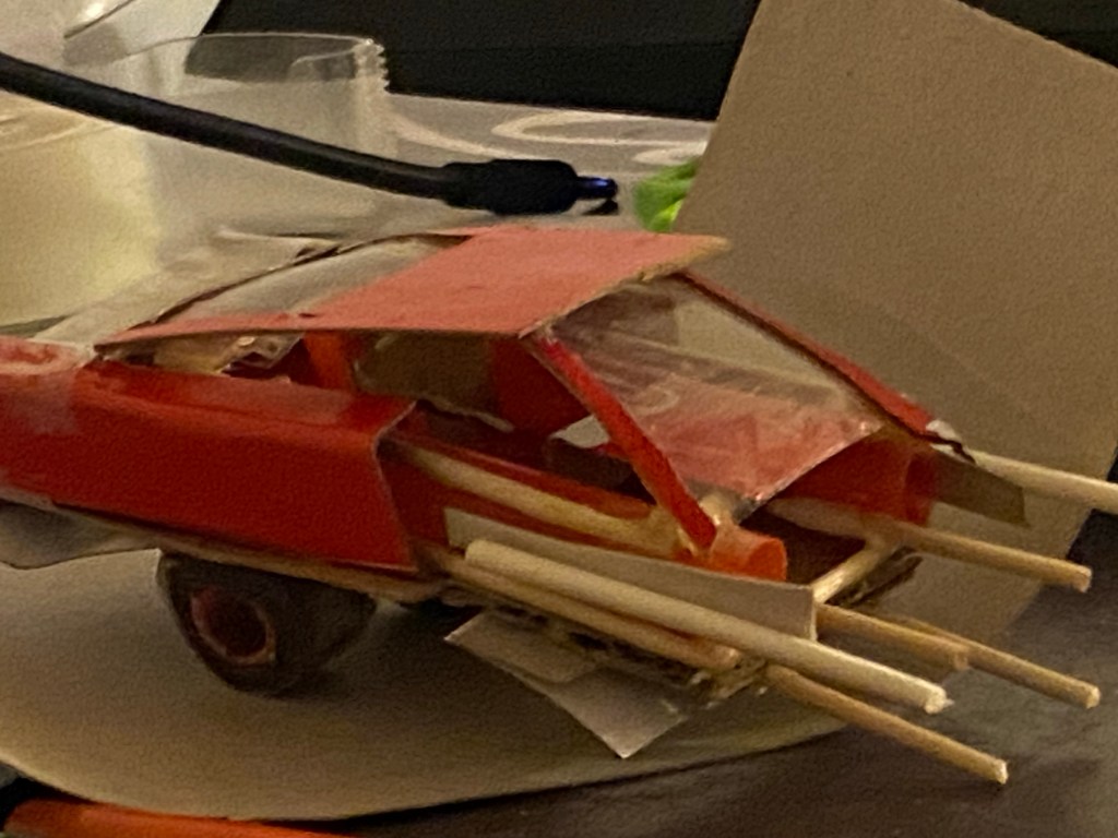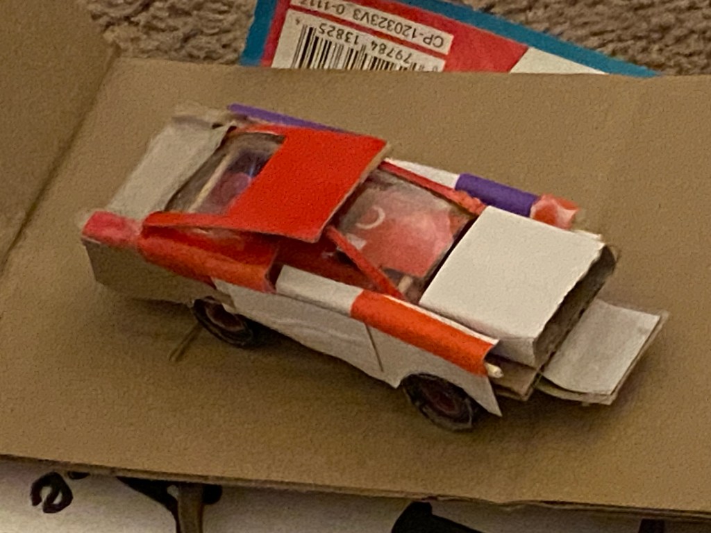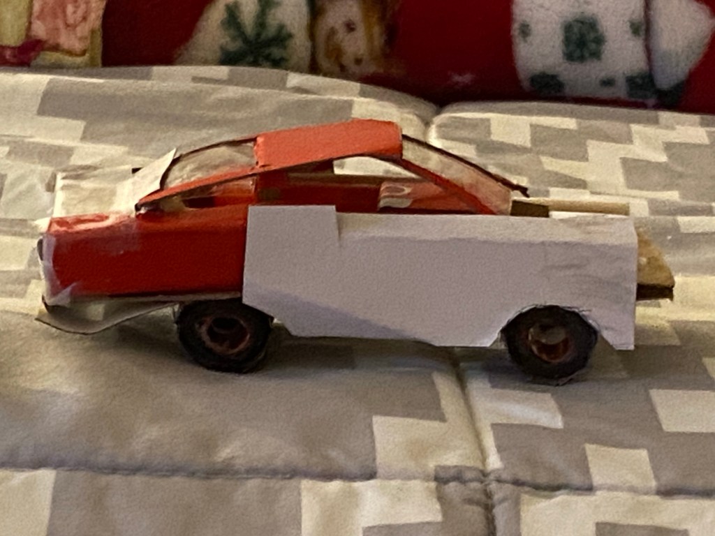 I’m working on it. Here are the pictures of me spilling glue and using water bottles and scrap paper from work and other places to piece this vehicle together. I used a Coca Cola 24 pack box’s cardboard to formulate a futuristic car from the fictional entity known as the Ford Vehicle Company.