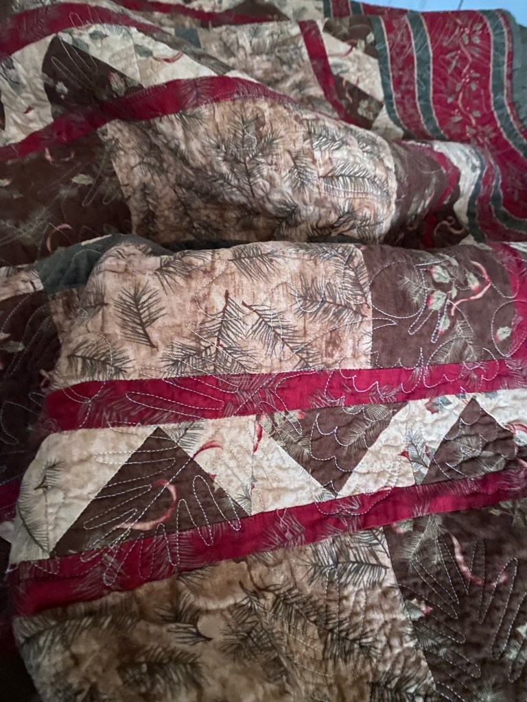 MY GIRLFRIEND’S MOM MAKES THESE BLANKETS. OURS, THE ONE IN THE PICTURE SAT ON HER PARENTS WOODEN BANISTER FOR A LONG TIME. I LIKE THE SMELL OF THE FRESH WOOD. COMMMMFY!