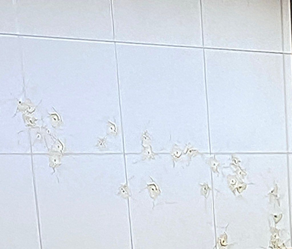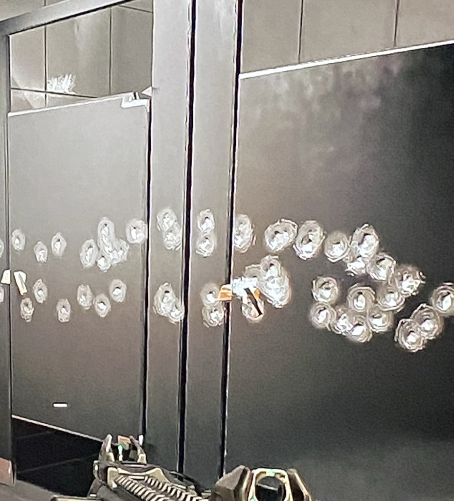 She is shaken but ready to kill again without hesitation. She thinks ‘fuck it then’ and begins firing through the 5 by 5 inch white tiles of the entrance.